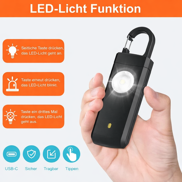 Der Alarm erreicht eine Lautstärke von bis zu 120 Dezibel, genug, um Aufmerksamkeit zu erregen und potenzielle Gefahren abzuschrecken.